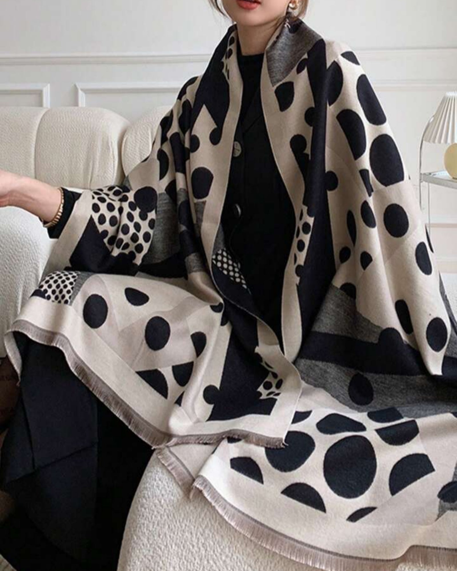 Make a statement with this oversized Abstract Dot & Block Reversible Wrap . Features a modern abstract dot and block pattern. Soft, warm, and perfect for fall layering.