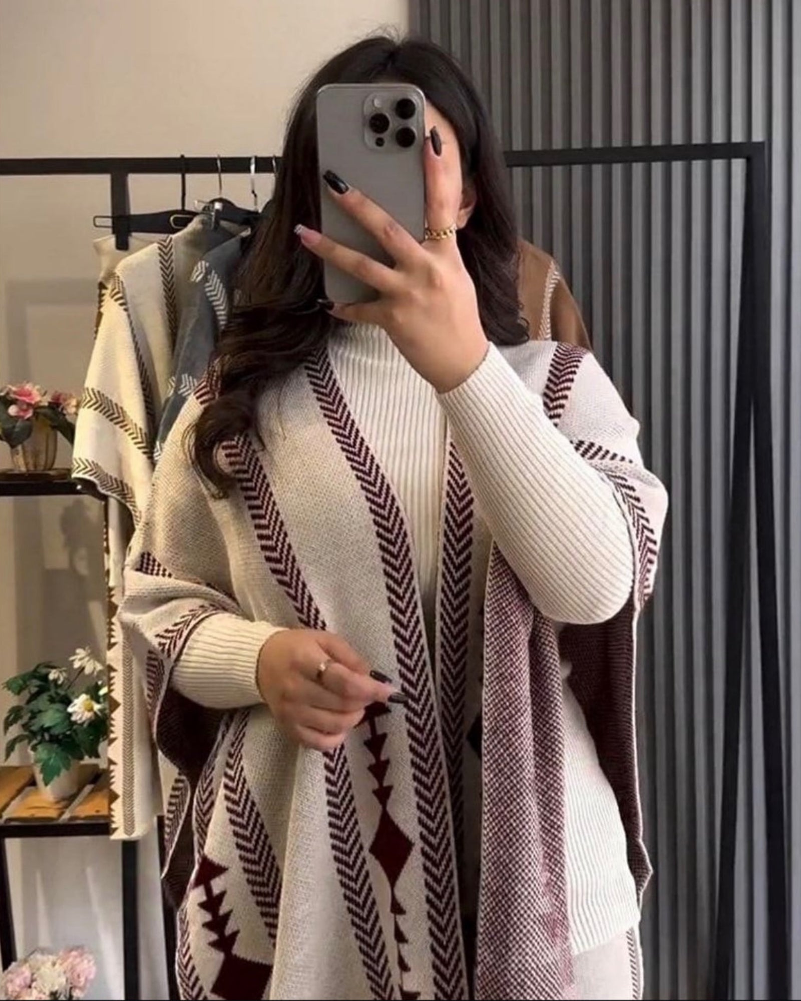 • Complete Coordinated Look: A stylish three-piece set including a matching patterned poncho/cape, fitted long-sleeve sweater, and comfortable trousers.