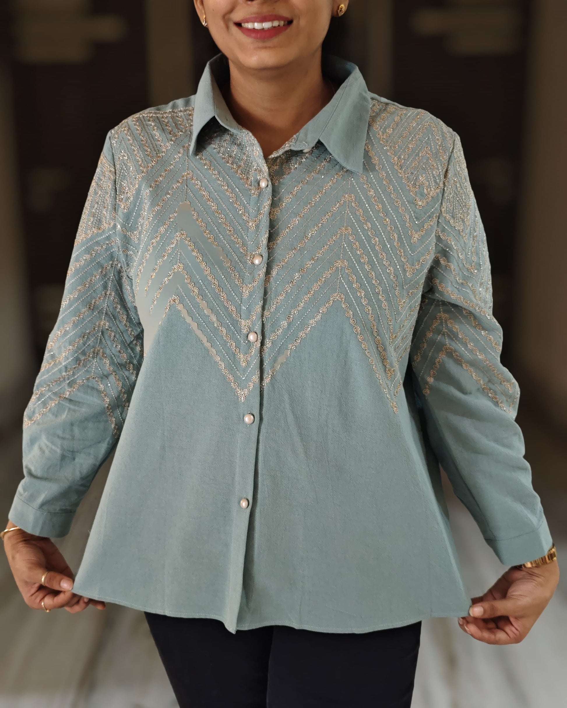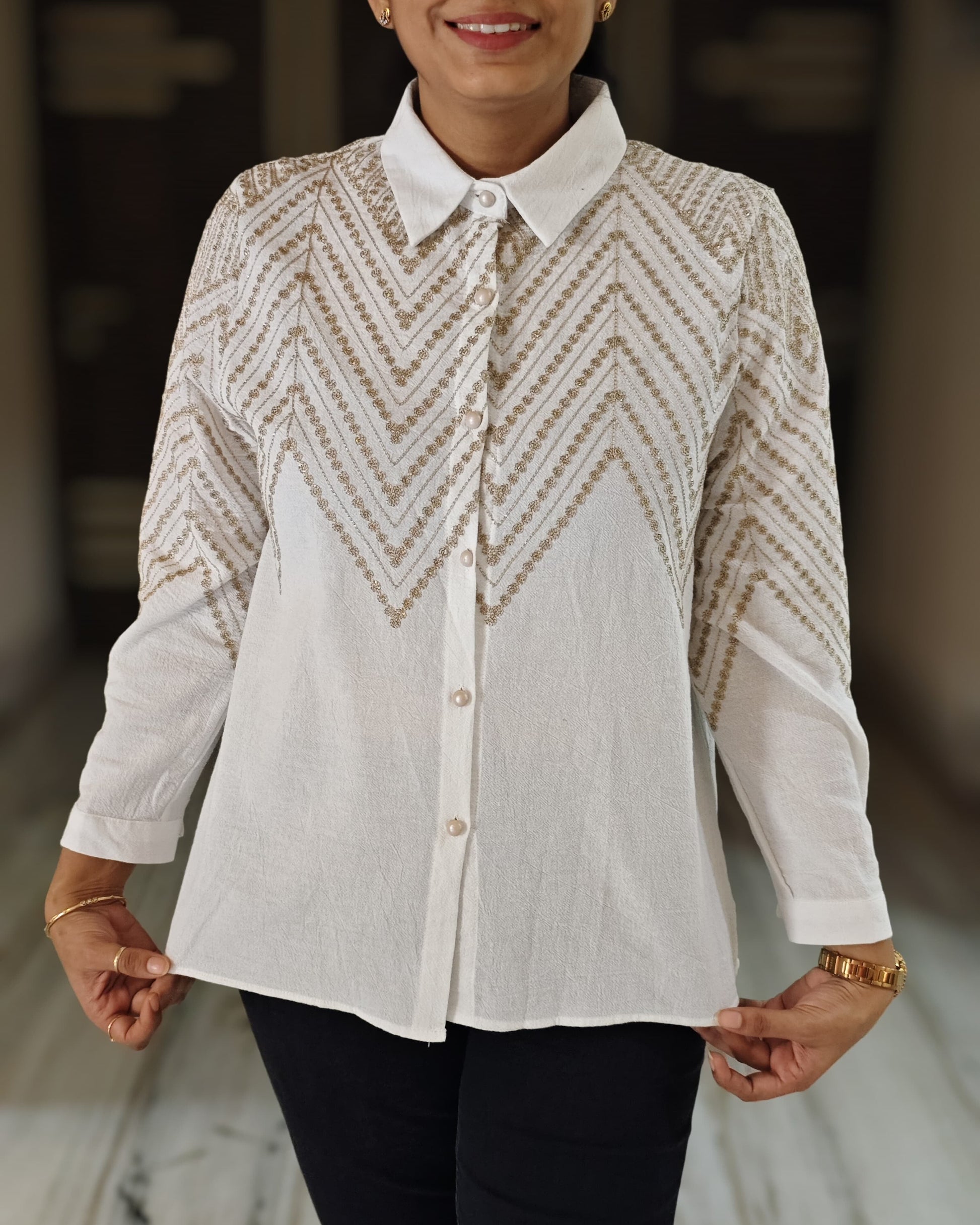 Make a statement in the Chevron Embroidered Charm Shirt, a perfect blend of comfort, craftsmanship, and contemporary style. Featuring intricate chevron embroidery across the chest and sleeves, this shirt adds a touch of elegance to your everyday wardrobe. Designed in a relaxed fit with soft, breathable fabric, it’s ideal for casual outings, workwear, or brunch dates. Style it tucked or loose for an effortless look.
