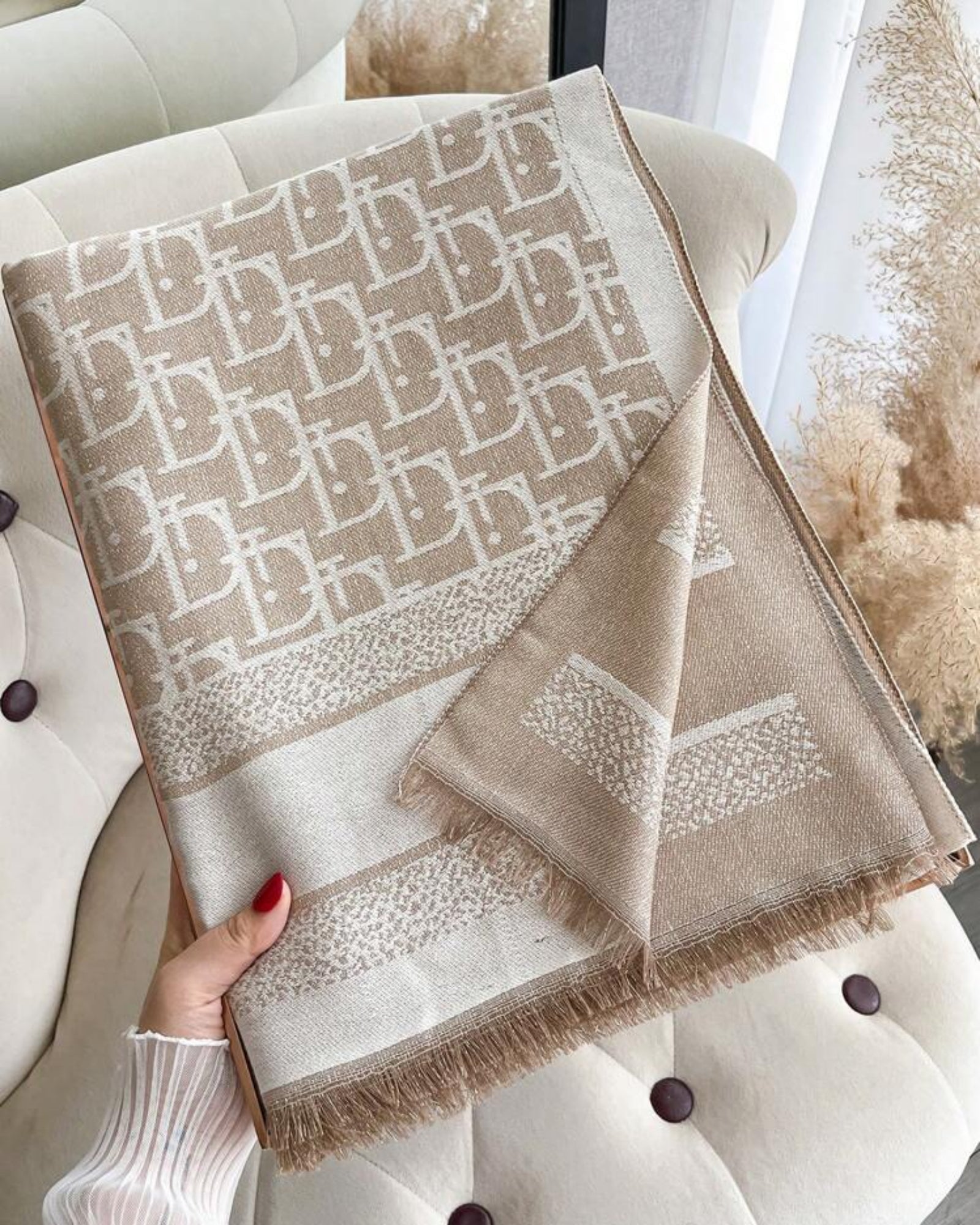 Wrap yourself in luxury with our oversized Monogram Jacquard Shawl. This elegant beige and tan reversible knit wrap offers cozy warmth and high-fashion style. Perfect for travel or a chic layering look. Shop now for this designer-inspired accessory