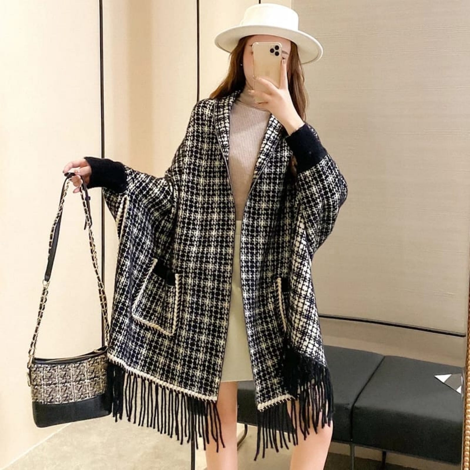 Elevate your winter layering with this Hail chess weave winter wrap shawl for women. Designed in a classic checkered pattern with soft knit fabric, fringe detailing, and functional pockets- perfect for everyday wear, travel, and cozy winter styling.