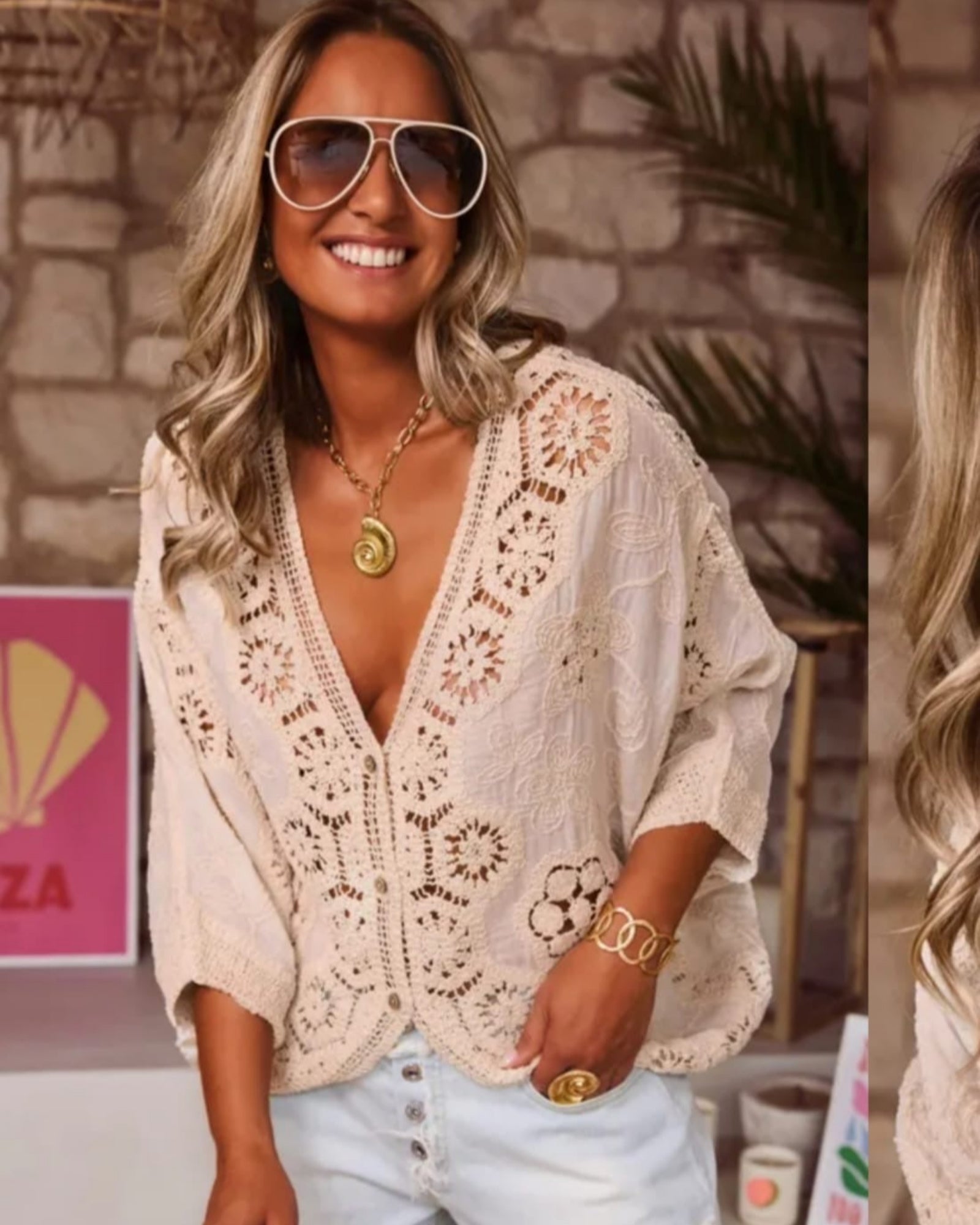 Introducing the Hathor Muse Crochet Blouse – a must-have bohemian lace blouse that blends comfort with effortless elegance. Designed with handcrafted floral crochet work, this lightweight summer top features a V-neckline, wooden buttons, and relaxed half sleeves – perfect for layering or wearing solo.