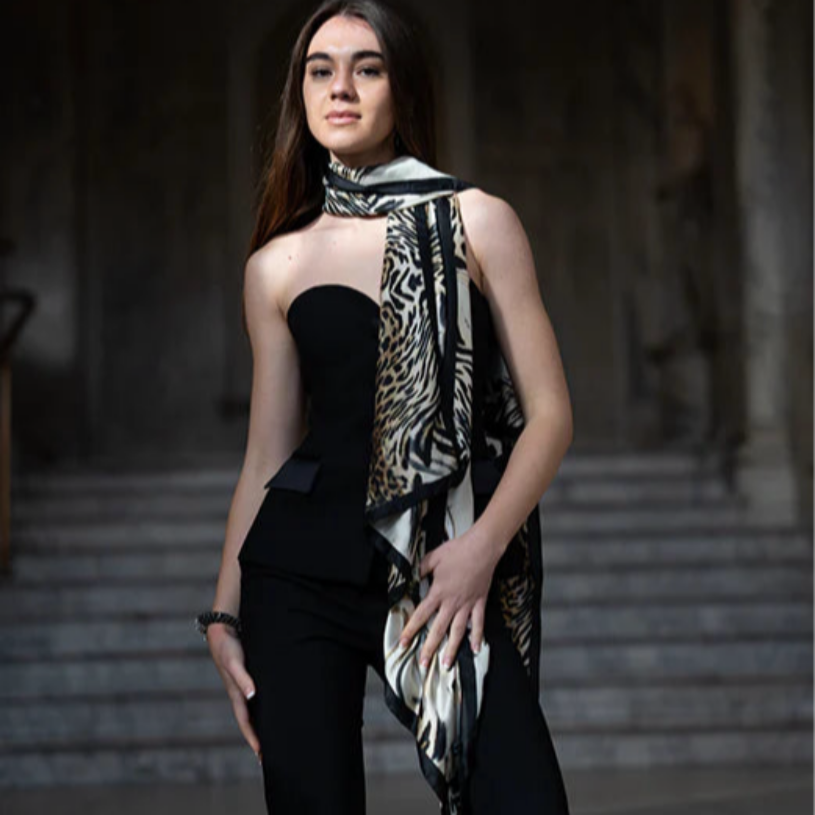 Drape yourself in luxury with the Luxe Savannah Silk-Scarf. This elegant animal print stole features a rich leopard and zebra pattern with a sophisticated black border. Perfect for adding a bold, chic statement to any outfit. Shop silk-feel scarves and designer animal print wraps online now.