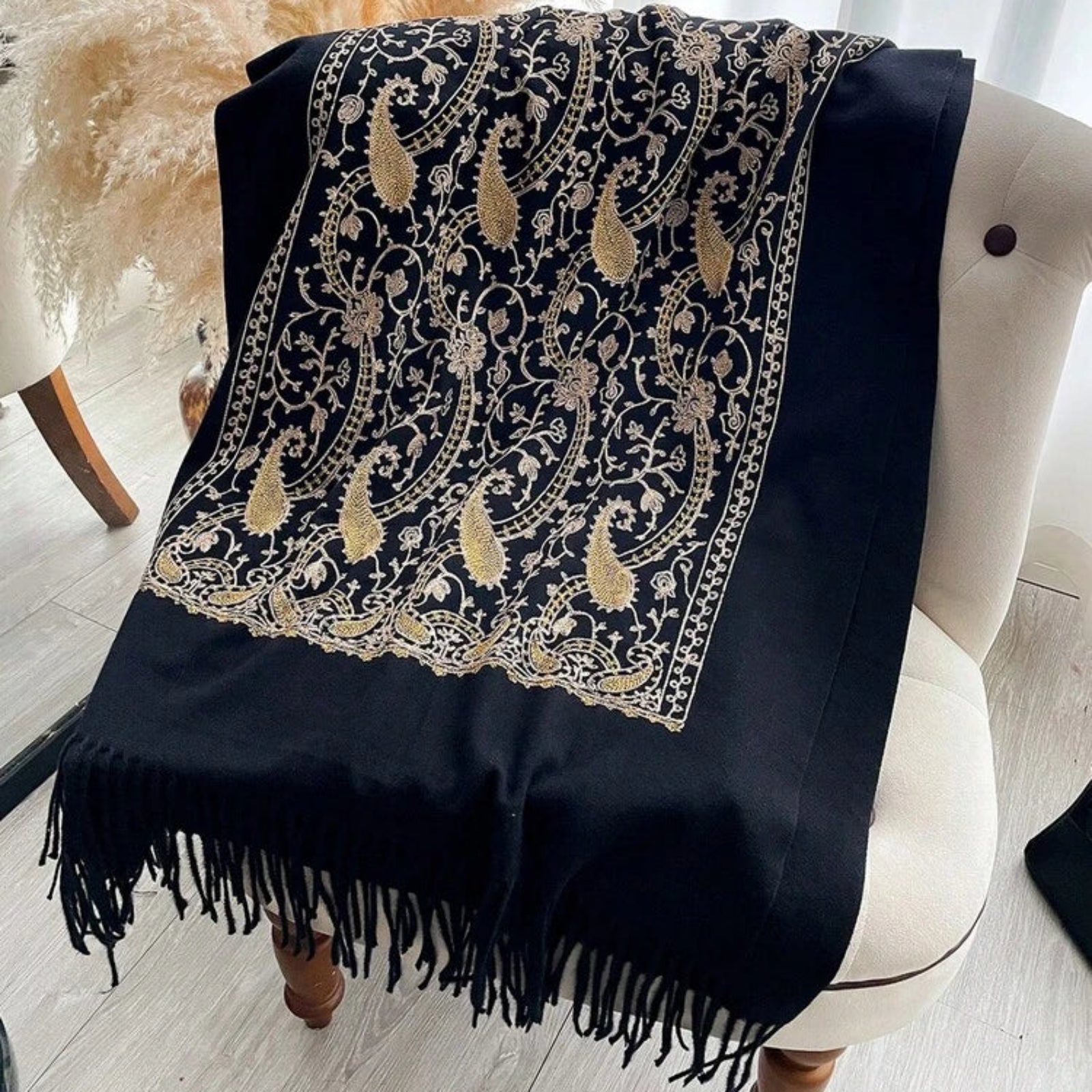 - Luxurious black winter stole adorned with intricate vintage inspired embroidery