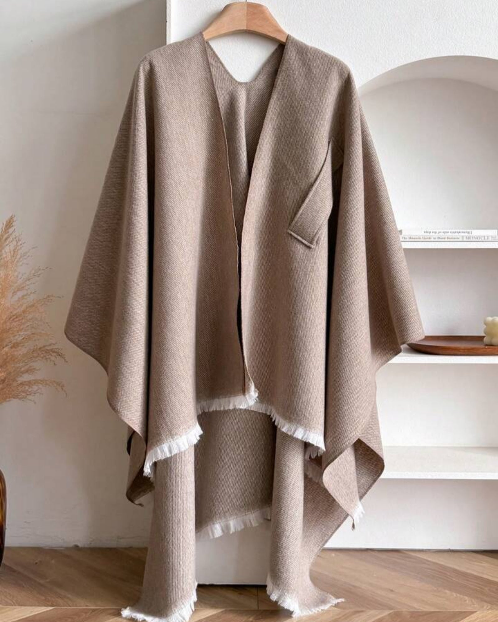 Wrap yourself in luxury. This soft, oversized knit travel shawl in a rich neutral tone features a subtle chevron pattern and delicate fringe. Your perfect versatile travel companion.