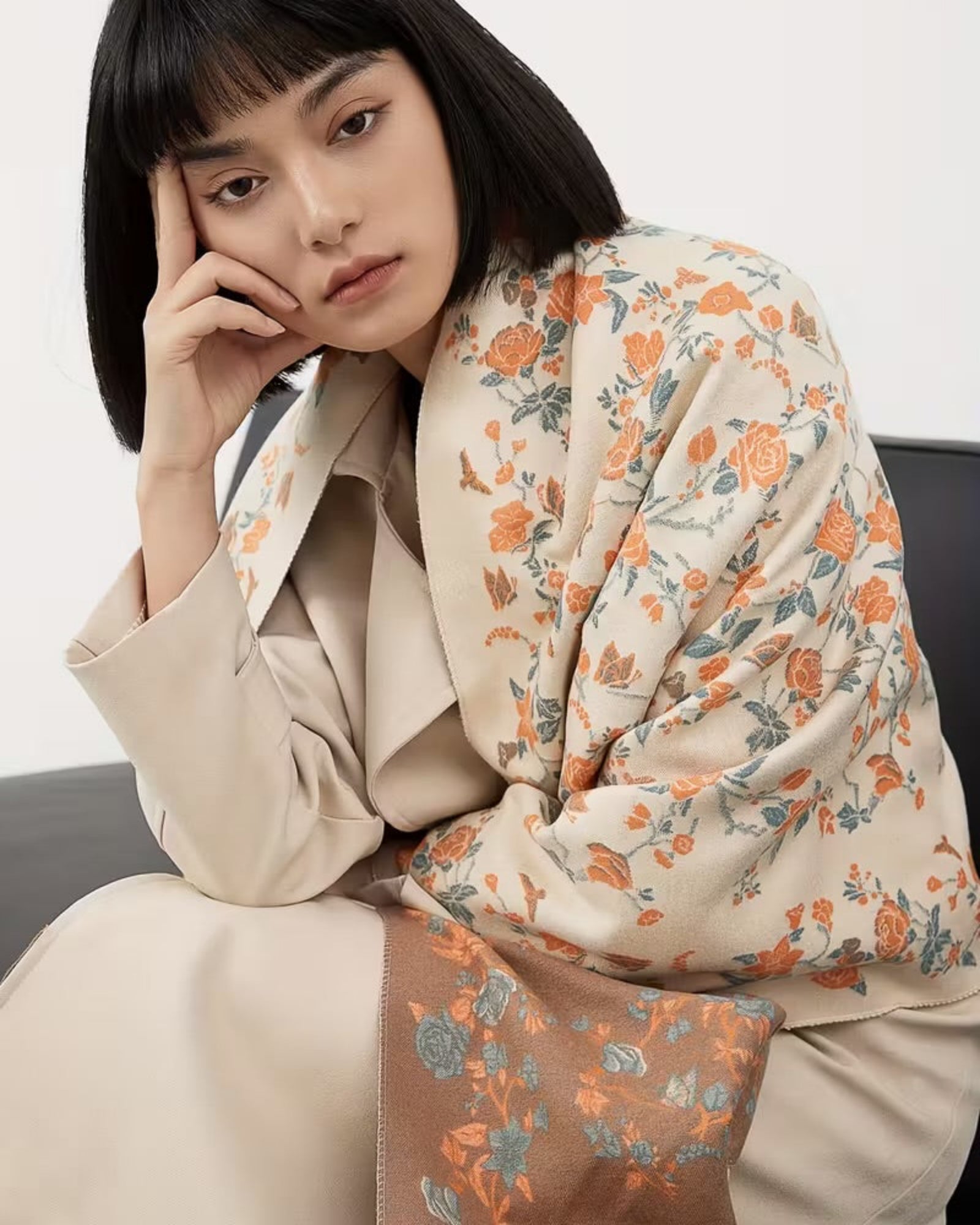 Discover the ultimate Winter Floral Scarf. This reversible, double-sided pashmina features an elegant autumn-tone rose print on a soft, warm cashmere-feel fabric. Perfect for layering over coats or as a stylish winter wrap.