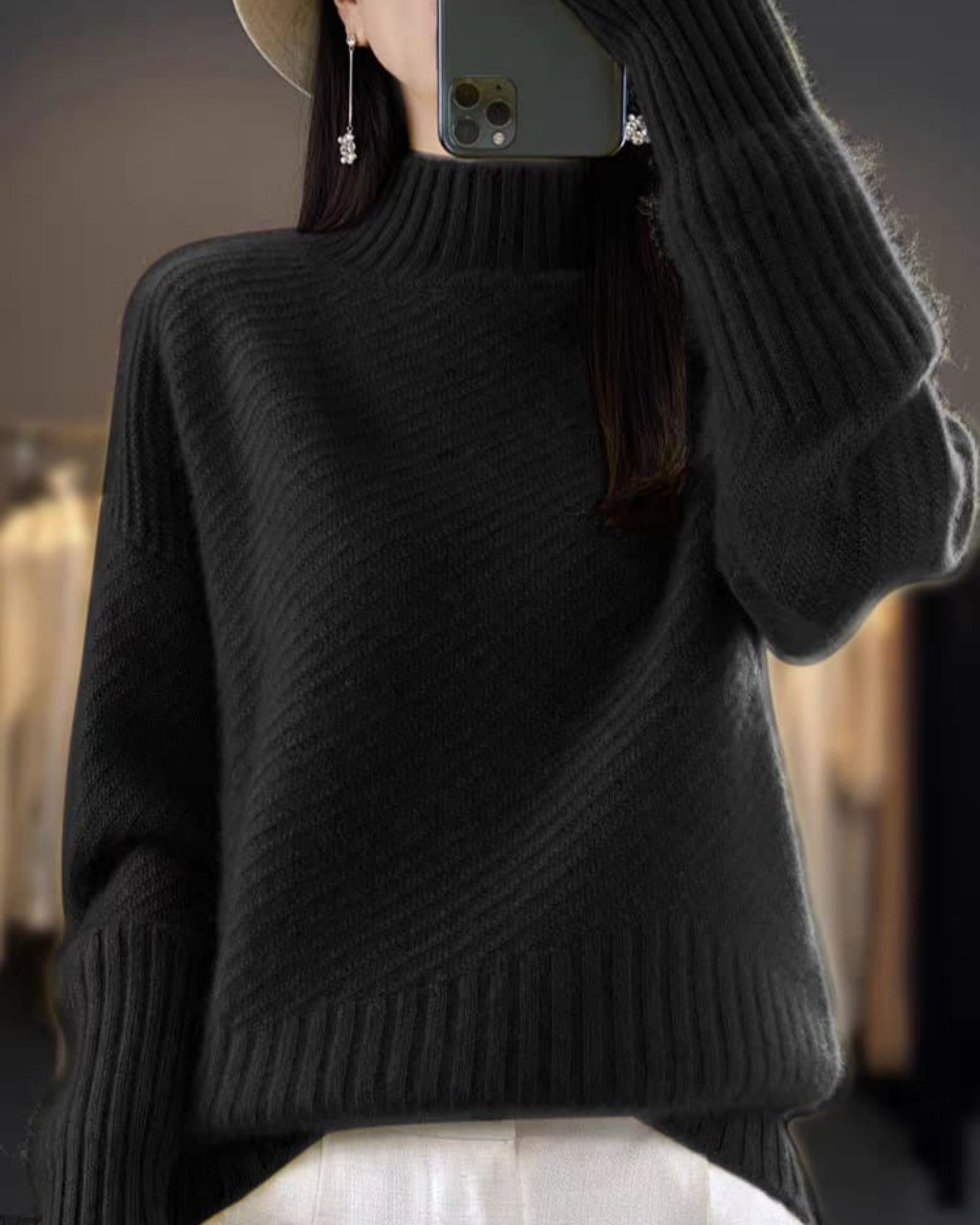 Wrap yourself in warmth with our luxury high-neck sweater. Featuring a soft cashmere blend and elegant diagonal rib knit. Available in 5 essential colors: Red, Yellow, Beige, Black, and White.