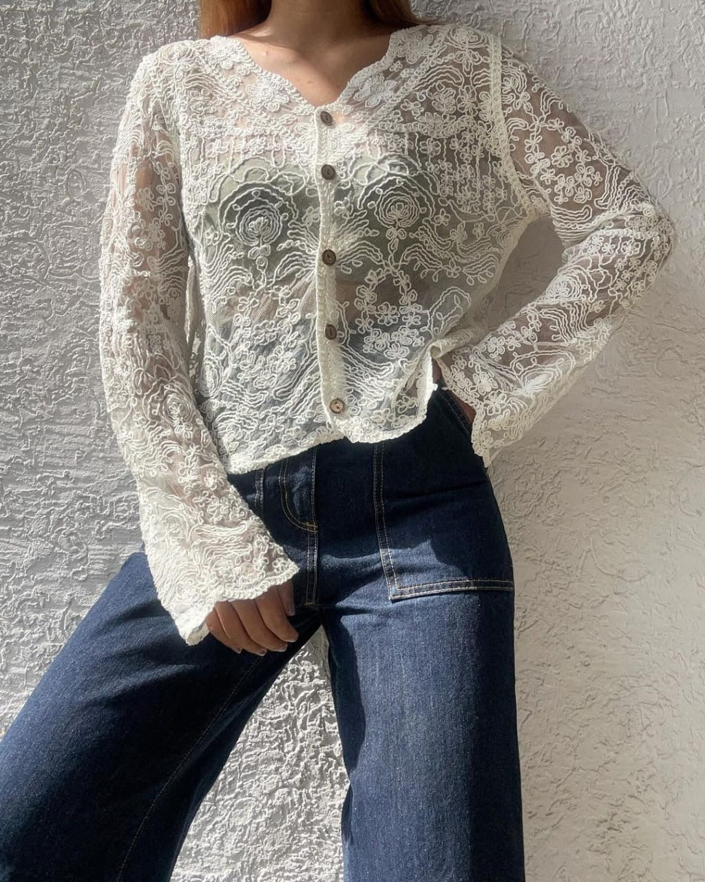 Indulge in luxury with the Morella Crochet Crop Top. This elegant buttoned shirt features delicate crochet details, making it a sophisticated addition to any wardrobe. Exude exclusivity and style with this tasteful piece that alludes to the world of art and fashion. Elevate your look with the Morella Crop Top.