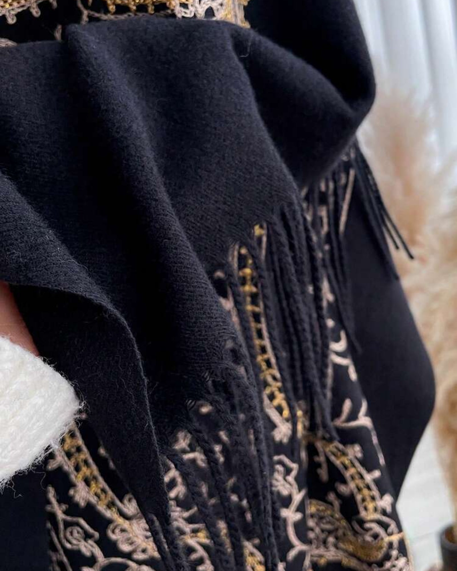 - Luxurious black winter stole adorned with intricate vintage inspired embroidery