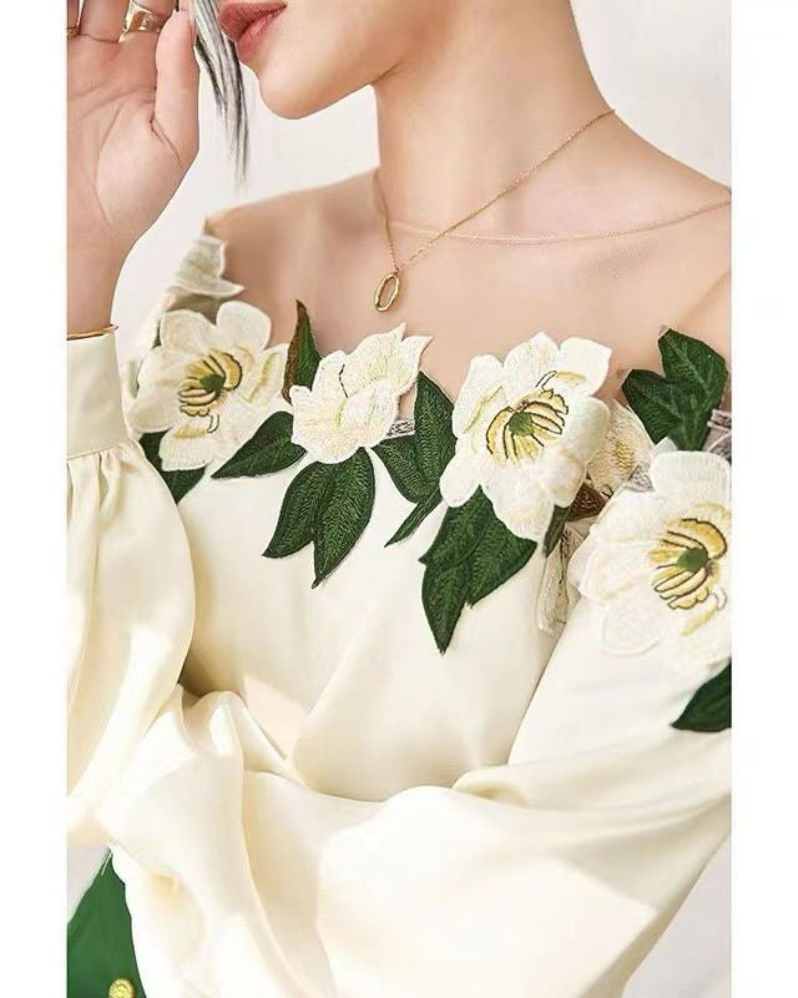 This elegant Veiara floral Silk top will add a sophisticated touch to your wardrobe. Crafted from luxurious fabric, it features an intricate mesh neckline with delicate floral embroidery, perfect for brunch or dinner. Compliment this statement piece with tailored trousers or skirts for an effortlessly graceful look.